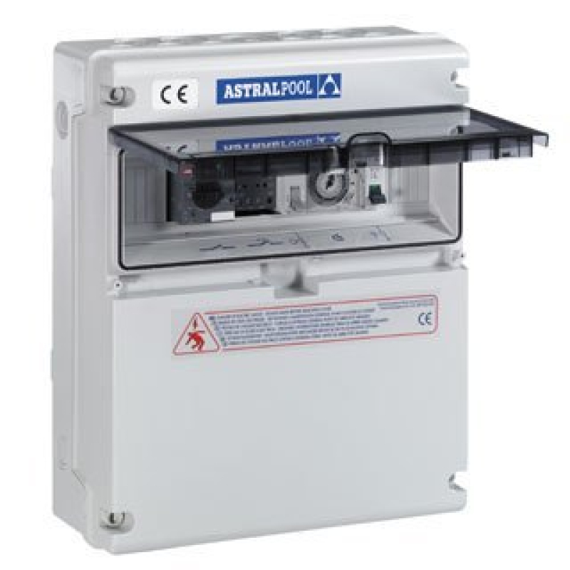 Protección magnetotérmico (1 bomba: de 1,6 a 10A) contactor, reloj de programación 24h. 3 posiciones: Auto/ 0 / manual. 230V 10A salida protegida para luces. 12V 630VA salida protegida para 2 luces subacuáticas y 12V 315VA salida protegida para 1 luz suacuática.