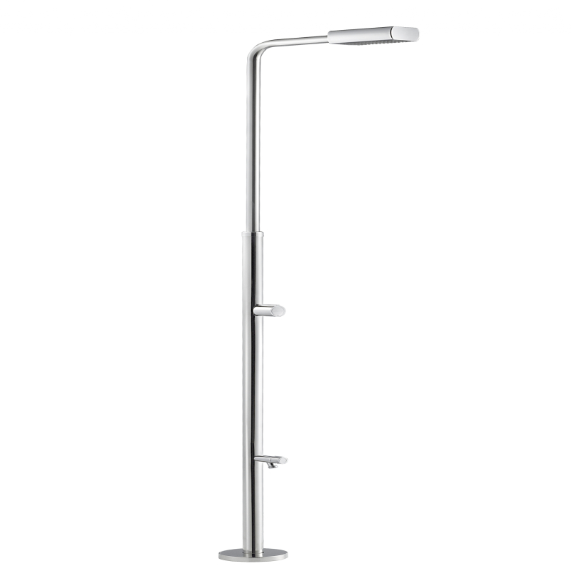 Ducha de acero inoxidable pulido AISI-304 (diámetro 43 mm) con 1 rociador antical cromado y una válvula de apertura caudal. Incluye grifo lavapiés. Con anclaje incorporado 00107
