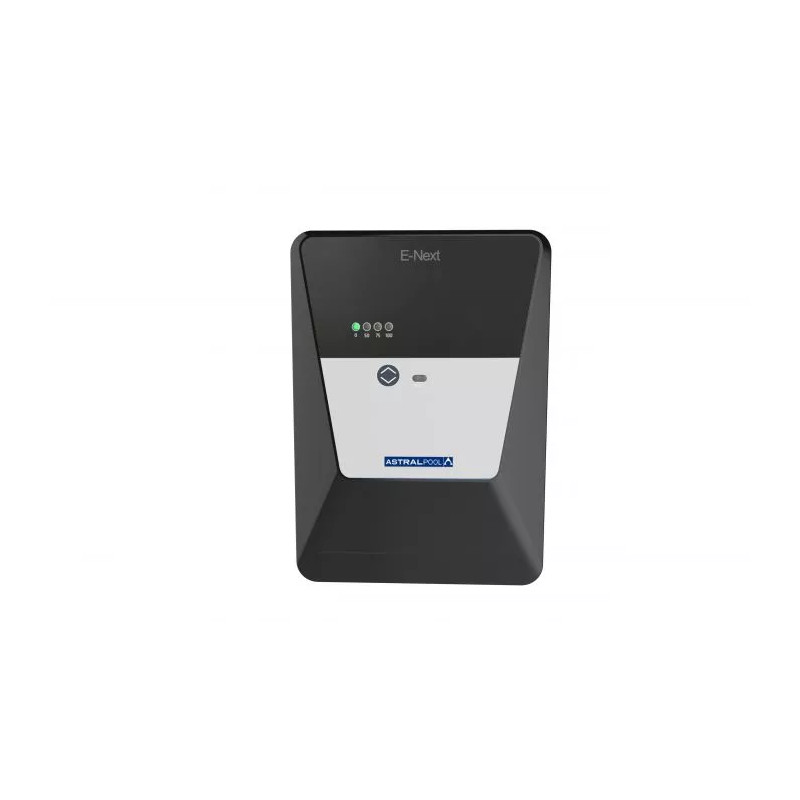 El sistema de electrólisis salina E-Next puede tratar piscinas de hasta 180 m³. Desinfecta automáticamente y reduce la producción de cloro si la piscina está equipada con una cubierta automática (contacto seco especial). La inversión de la polaridad ayudará a limpiar los electrodos y su alarma de sal avisa al usuario si la concentración de sal es baja para evitar daños en la célula y que la piscina se vuelva verde.