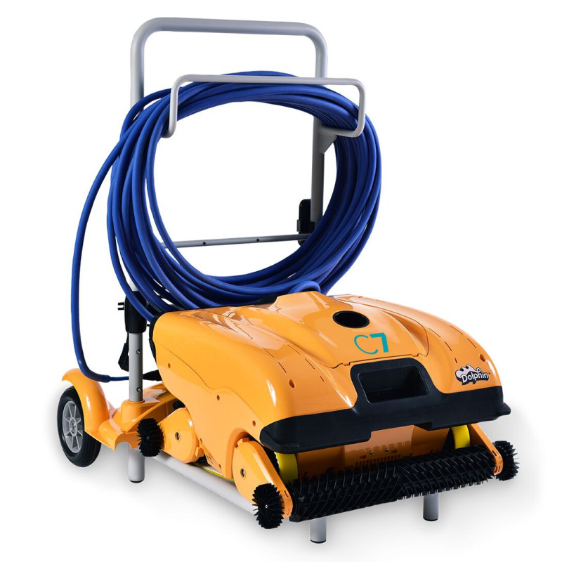 El limpiafondos automático Dolphin C7 ha sido diseñado para piscinas comerciales de tamaño mediano de hasta 33 m. Está equipado con un sistema de filtración de gran capacidad y cepillos dobles para garantizar la cobertura total del fondo, las paredes y la línea de flotación. Cuenta con un carro para que sea más fácil transportarlo y almacenarlo.