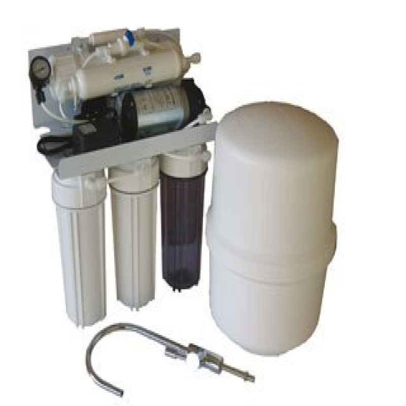 Equipo de osmosis inversa de 5 etapas con bomba y flusing automático para purificar agua a una presión de entrada mínima de 1 bar.