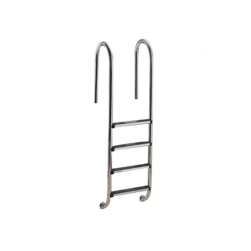 Modelo STANDARD 2 peldaños Escaleras con pasamanos modelo Muro, para piscinas enterradas, fabricadas en tubo Ø43mm de acero inoxidable acabado pulido brillante. Peldaños en acero inoxidable. Su cuidado diseño garantiza seguridad contra todo tipo de deslizamientos o cortes. Suministradas con anclajes de fijación, previstos para conexión a toma equipotencial. – Modelo LUXE: Pasamanos y peldaños en AISI-316. – Modelo STANDARD: Pasamanos y peldaños en AISI-304.
