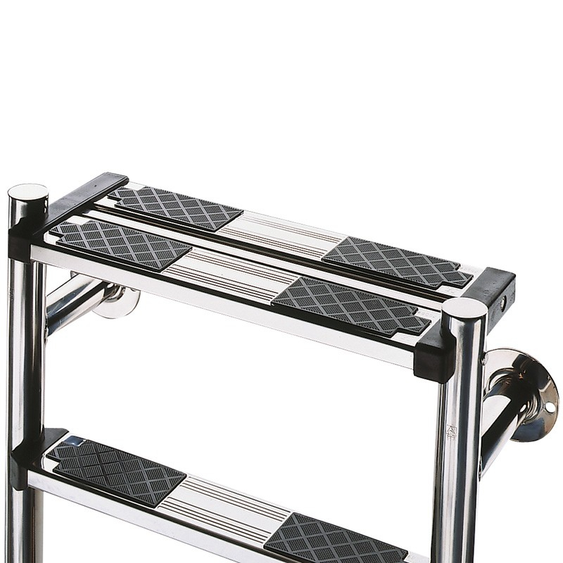 Peldaños y pasamanos Ø43mm en acero inoxidable AISI-316 pulido brillante. Fijación con pletinas, juntas elásticas, tacos anclaje y tornillos. Su cuidado diseño garantiza seguridad contra todo tipo de deslizamientos o cortes. Se puede utilizar con cualquier tipo de pasamanos de salida. Primer peldaño de seguridad.