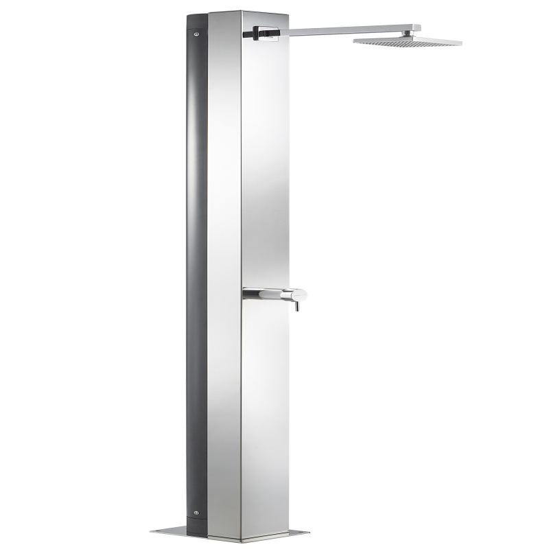 Ducha de acero inoxidable pulido AISI-304 que incorpora un rociador superior cuadrado cromado ( 150mm x 150mm), una válvula mezclador monomando ( fría y caliente) y un depósito de aluminio de 30 Litros de capacidad. Dotada de una maneta monomando y un rociador orientable cuadrado antical.