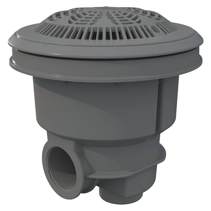 Sumidero NORM. Gama de sumideros, aptos para instalarse en piscinas públicas y privadas, se suministran con con rejillas planas o antivortex. Fabricados en ABS blanco y con tratamiento UV, conexiones de salida lateral de 2" y salida inferior de 1" ½, la salida inferior tapada con un semitroquelado. Rejilla antivortex, con insertos. Gris claro. Cumpe con las normas EN 16582-1 y 16713-2