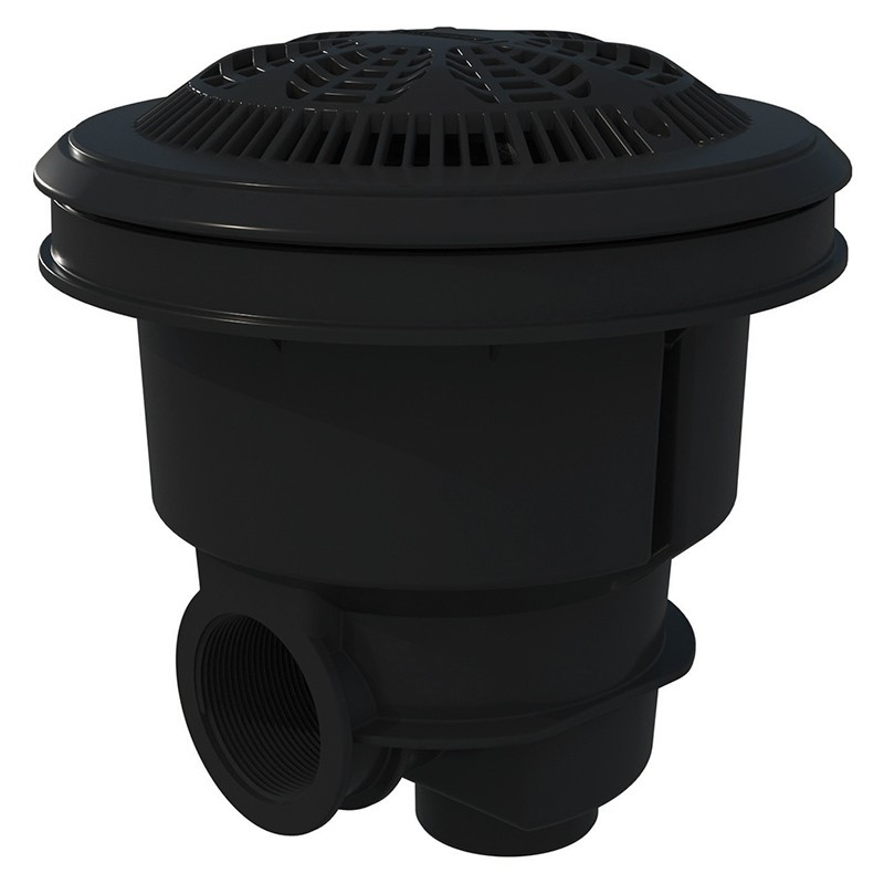 Sumidero NORM. Gama de sumideros, aptos para instalarse en piscinas públicas y privadas, se suministran con con rejillas planas o antivortex. Fabricados en ABS blanco y con tratamiento UV, conexiones de salida lateral de 2" y salida inferior de 1" ½, la salida inferior tapada con un semitroquelado. Rejilla antivortex, con insertos. Gris antracita. Cumpe con las normas EN 16582-1 y 16713-2.